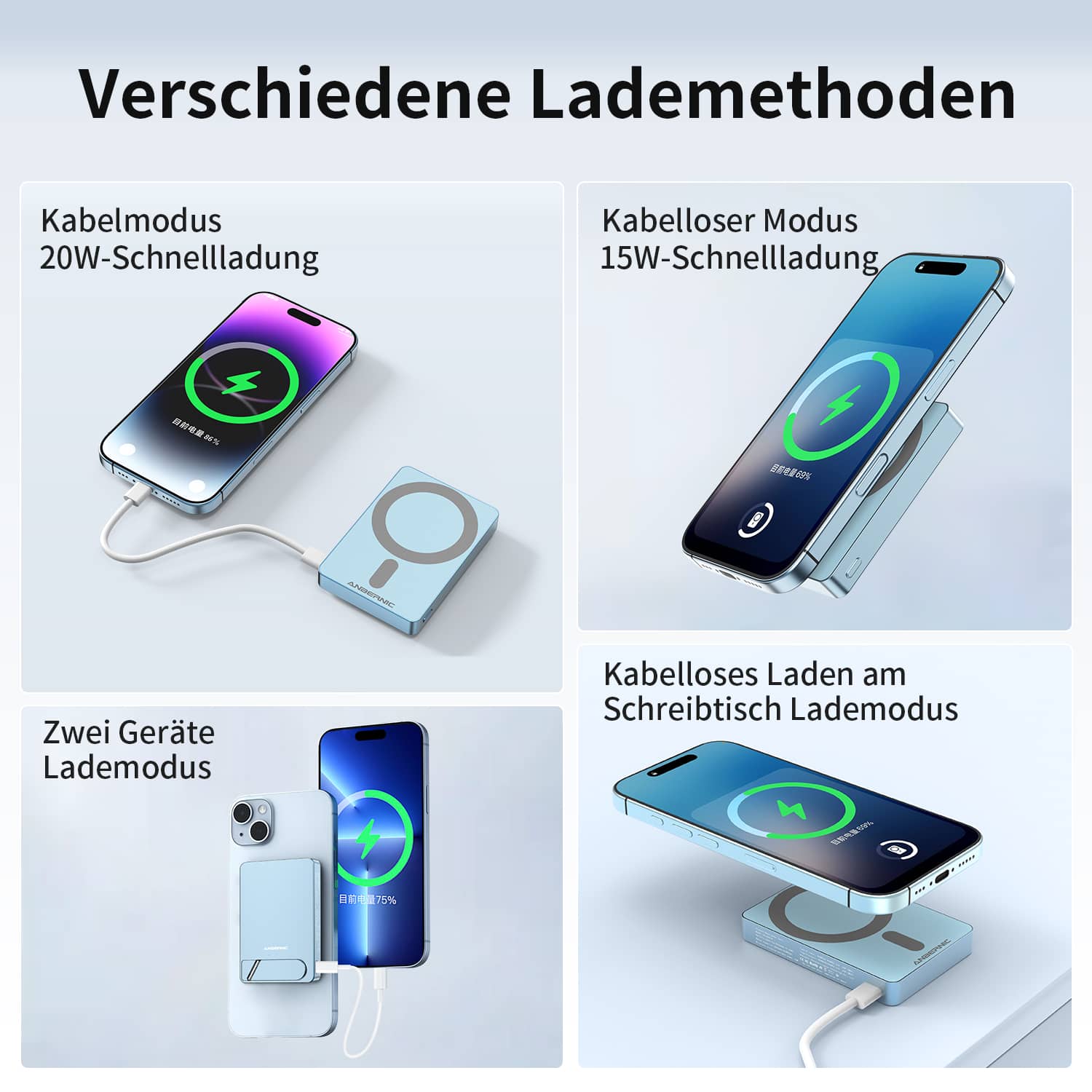| Weitere Funktion | Sofortladen mit integriertem Standdesign, kompatibel mit kabellos ladbaren Geräten von iPhone und Android. Starke magnetische Anziehung, gleichzeitiges Laden von zwei Geräten (kabellos und kabelgebunden) sowie Übertemperaturschutz für maximale Sicherheit. | |||