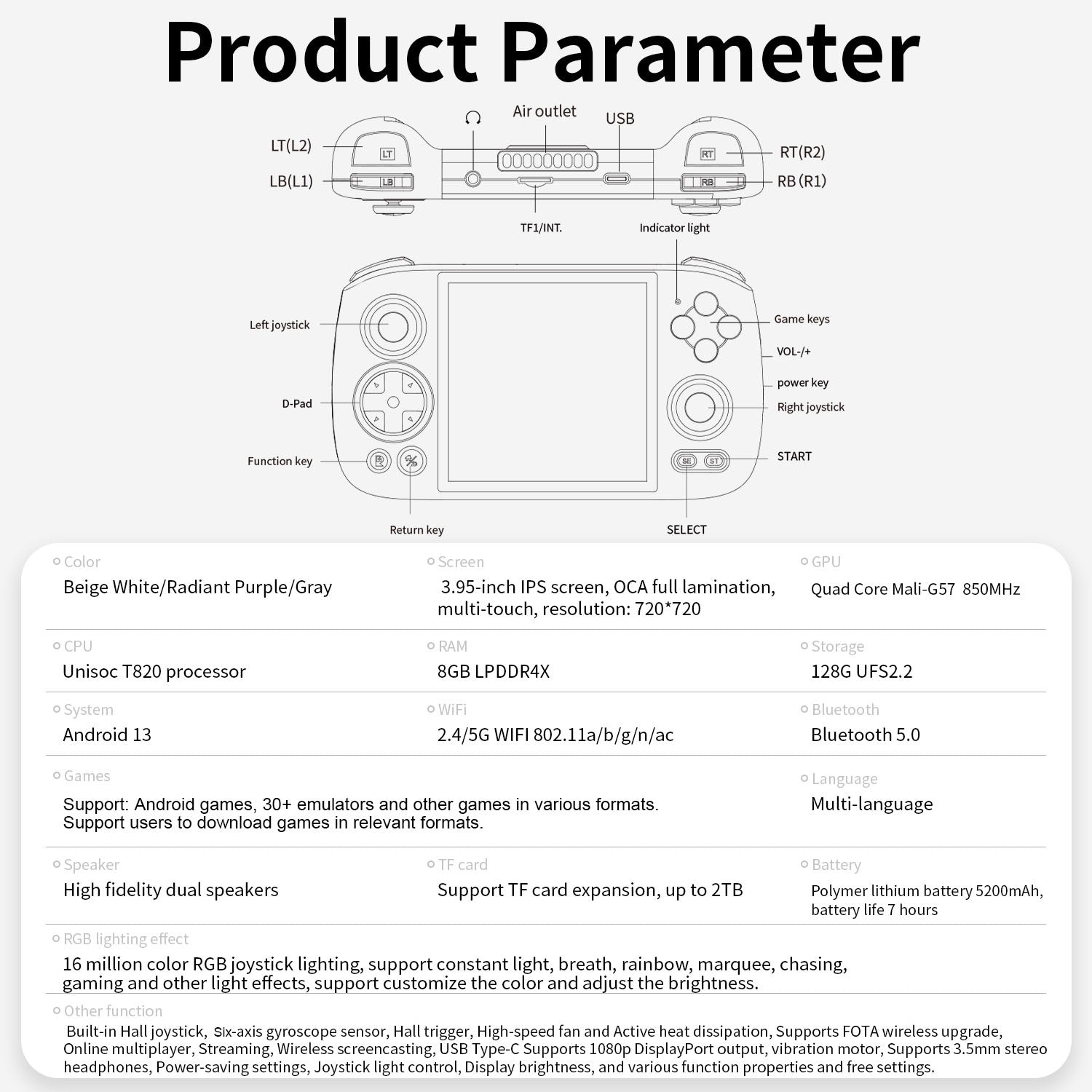 | Weitere Funktionen | Eingebauter Hall-Joystick, Sechs-Achsen-Kreisel, Hall-Auslöser, Hochgeschwindigkeitslüfter und aktive Wärmeableitung, Unterstützt FOTA-Wireless-Upgrade, Online-Multiplayer, Streaming, kabelloses Screencasting, USB-Typ-C unterstützt 1080p DisplayPort-Ausgang, Vibrationsmotor, Unterstützt 3,5-mm-Stereo-Kopfhörer, Energiespareinstellungen, Joystick-Beleuchtungssteuerung, Display-Helligkeit und verschiedene Funktionseinstellungen |