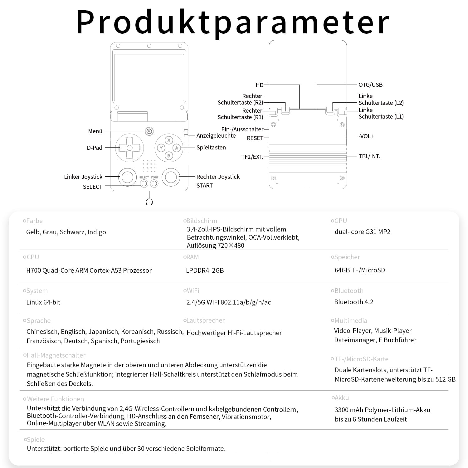| Weitere Funktionen | Unterstützt die Verbindung von 2,4G-Wireless-Controllern und kabelgebundenen Controllern, Bluetooth-Controller-Verbindung, HD-Anschluss an den Fernseher, Vibrationsmotor, Online-Multiplayer über WLAN sowie Streaming. | |||