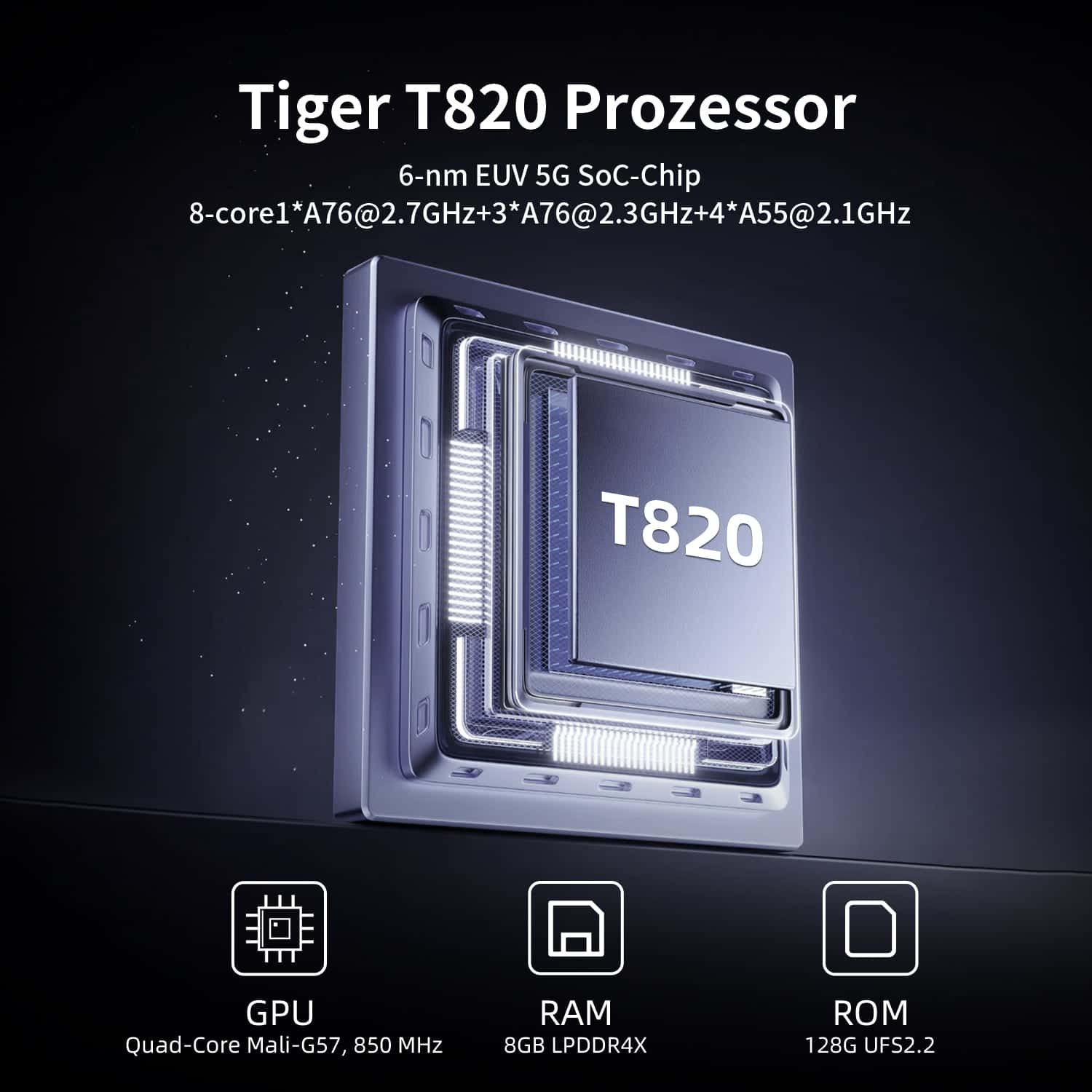 | CPU | Unisoc T820 processor, 6nm EUV 5G SOC chip octa core: 1*A76@2.7GHz + 3*A76@2.3GHz + 4*A55@2.1GHz |
