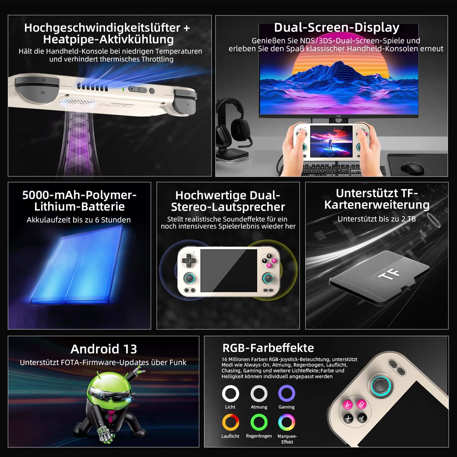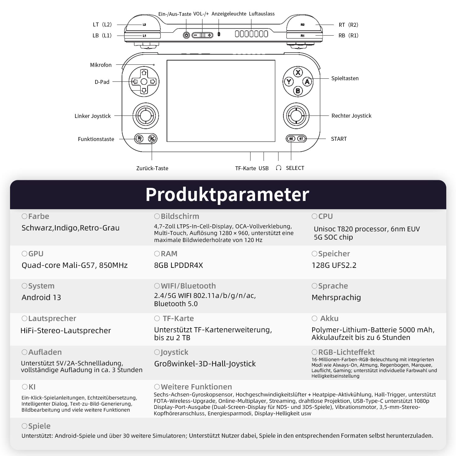 | Weitere Funktionen | Sechs-Achsen-Gyroskopsensor, Hochgeschwindigkeitslüfter + Heatpipe-Aktivkühlung, Hall-Trigger, unterstützt FOTA-Wireless-Upgrade, Online-Multiplayer, Streaming, drahtlose Projektion, USB-Type-C unterstützt 1080p Display-Port-Ausgabe (Dual-Screen-Display für NDS- und 3DS-Spiele), Vibrationsmotor, 3,5-mm-Stereo-Kopfhöreranschluss, Energiesparmodi, Display-Helligkeit usw. | |||