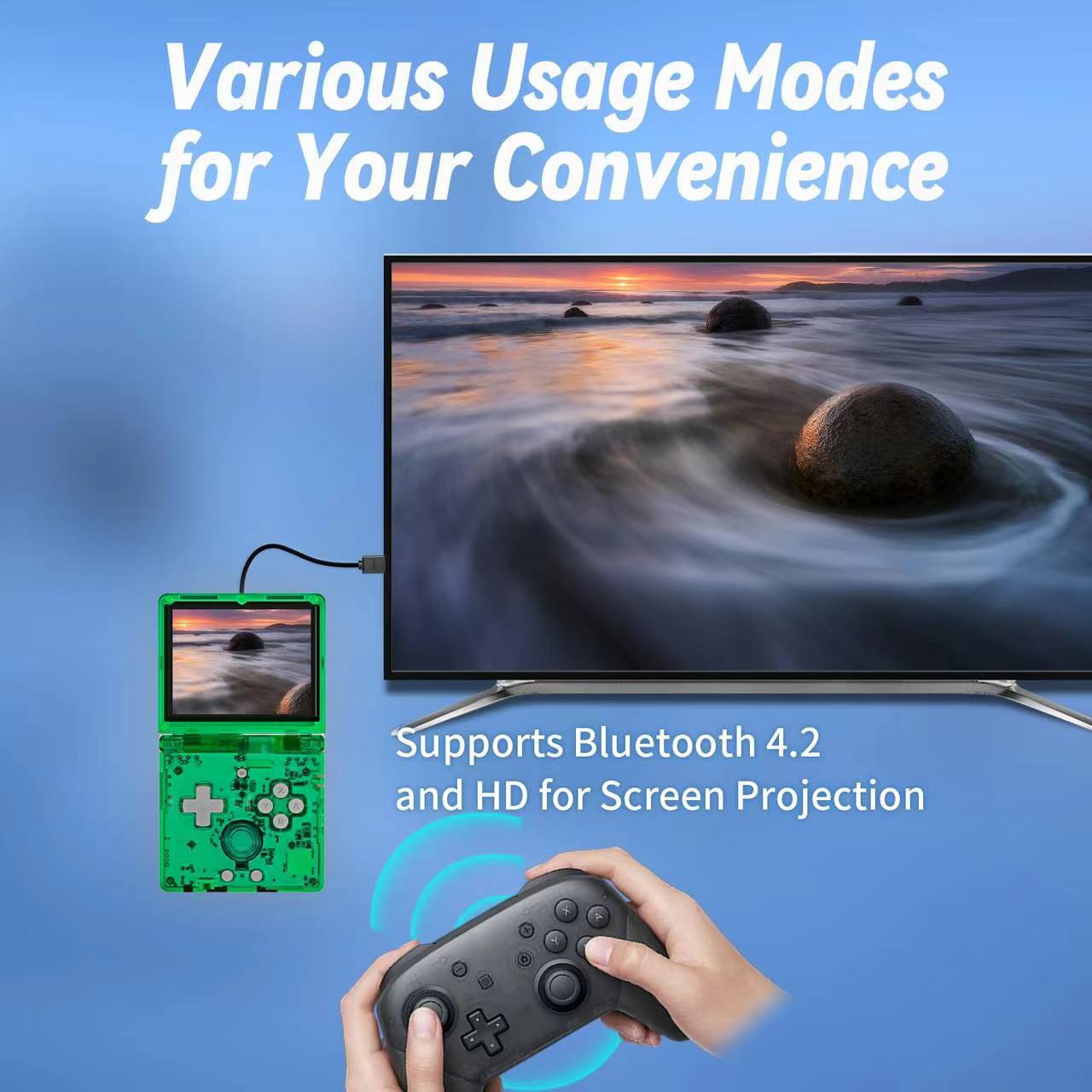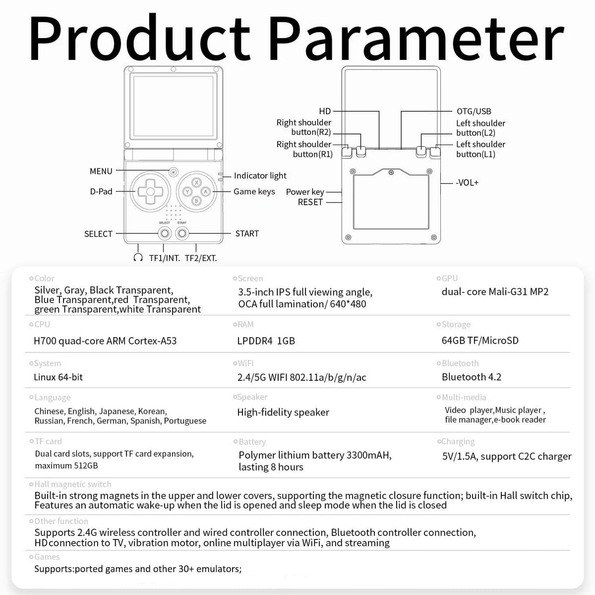 | Funciones adicionales | Admite controladores inalámbricos 2.4G y conexión de controlador con cable, conexión de controlador Bluetooth, conexión HD a TV, motor de vibración, multijugador en línea a través de WiFi y streaming. |